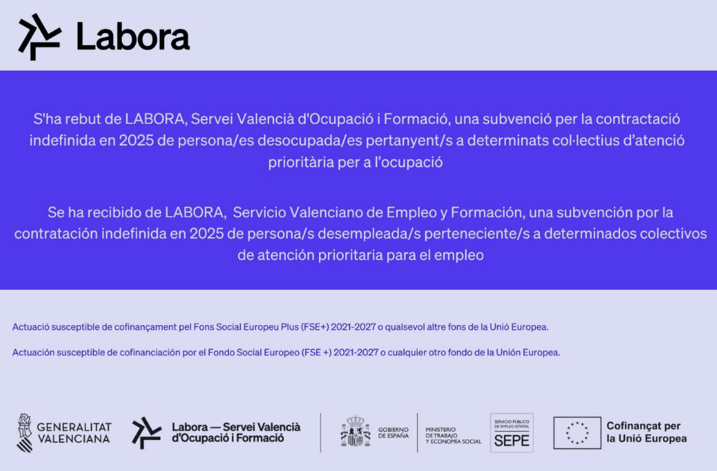 La empresa PLASE 2, S.L. fomenta la contratación indefinida de personas desempleadas pertenecientes a determinados colectivos de atención prioritaria para el empleo, gracias al programa ECOVUL/2025, por el que ha recibido una subvención de LABORA Servicio Valenciano de Ocupación y Formación y con la cofinanciación del Fondo Social Europeo por un importe total de 10.000 euros.