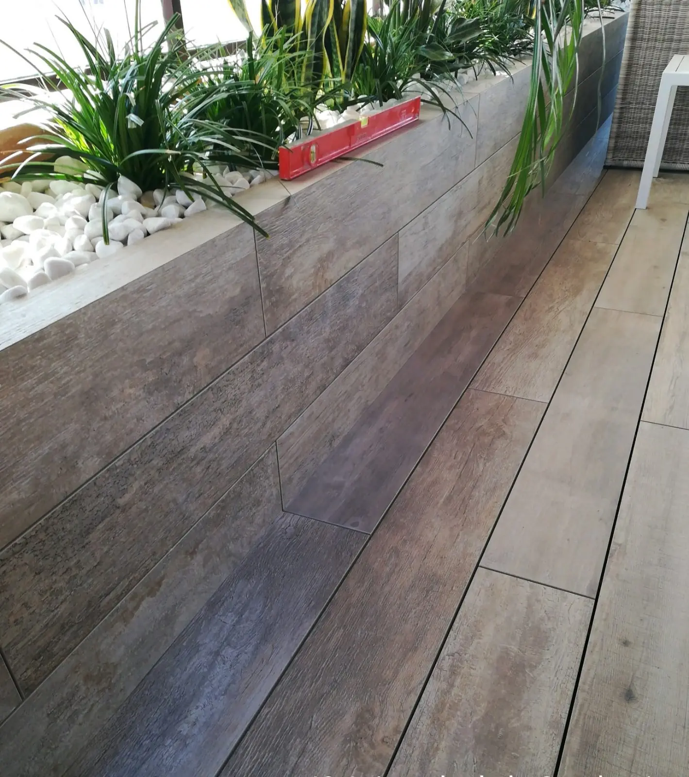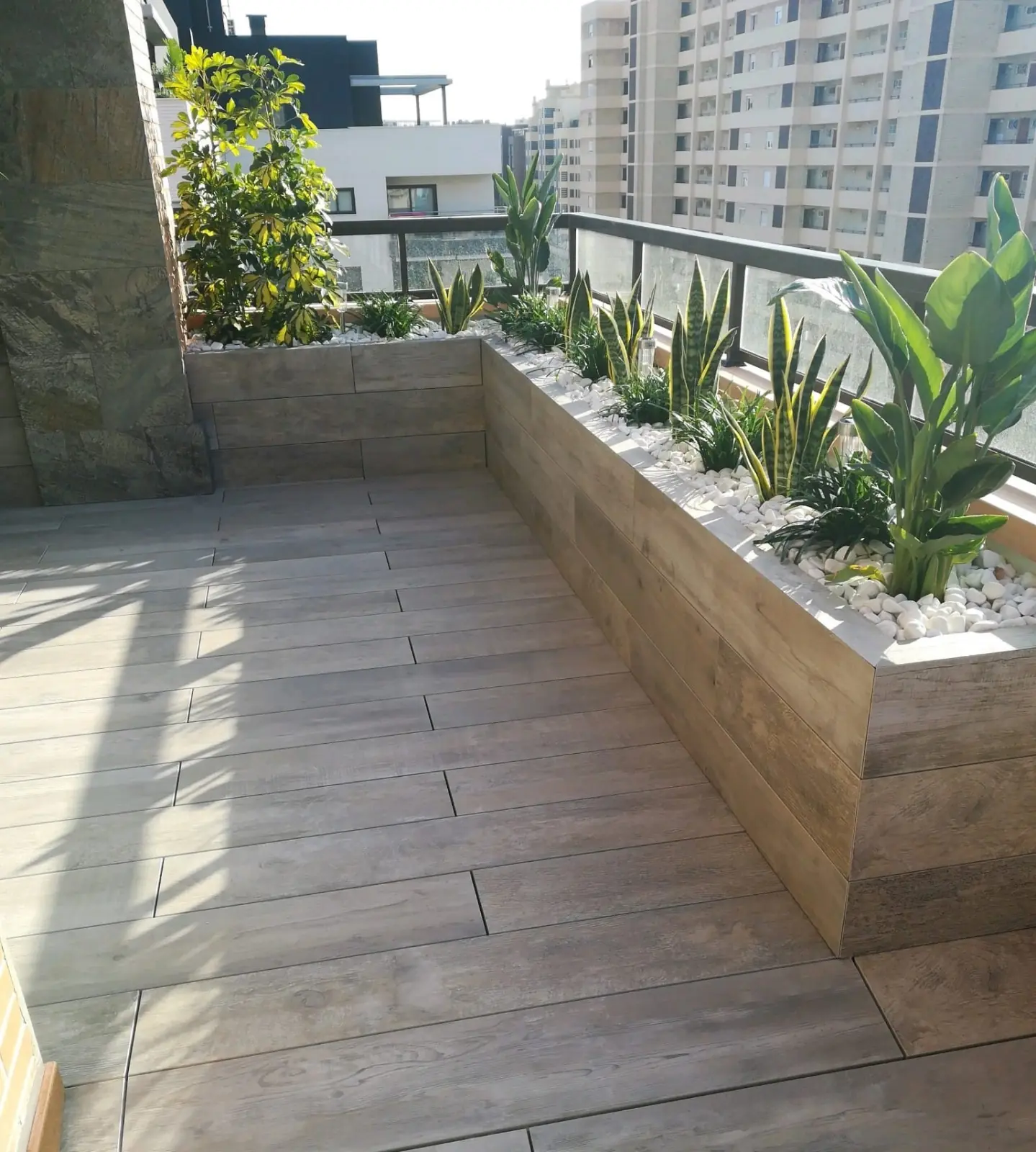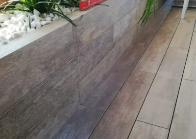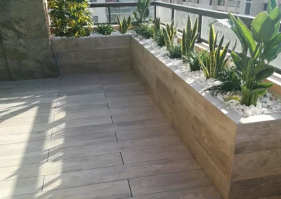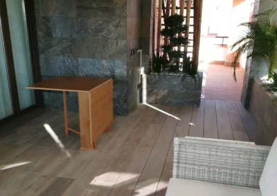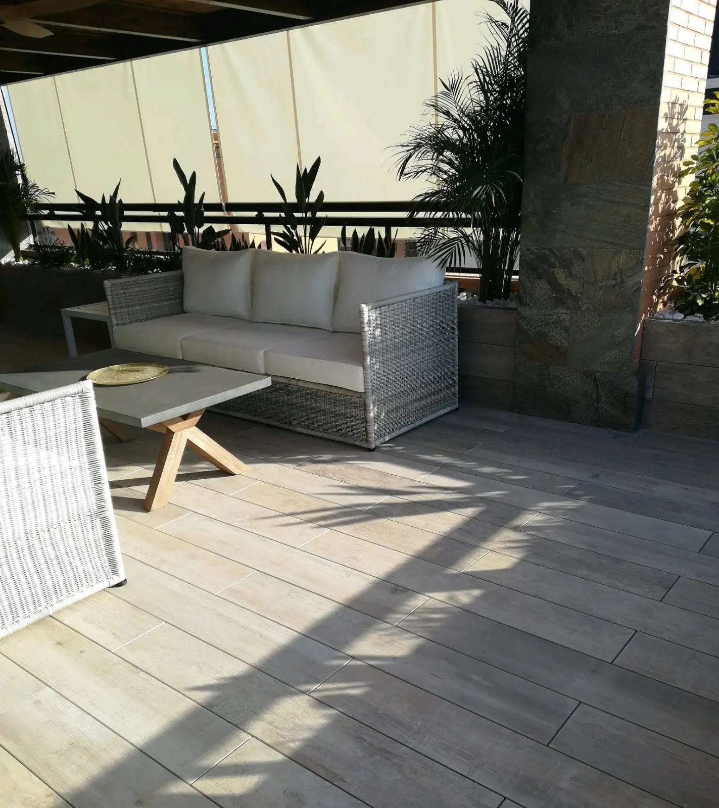 El elemento central de esta reforma de terraza es el nuevo pavimento porcelánico efecto madera. Este material no solo es visualmente atractivo, sino que también ofrece una durabilidad y resistencia excepcionales al clima, a la vez que proporciona la calidez de la madera sin sus inconvenientes.